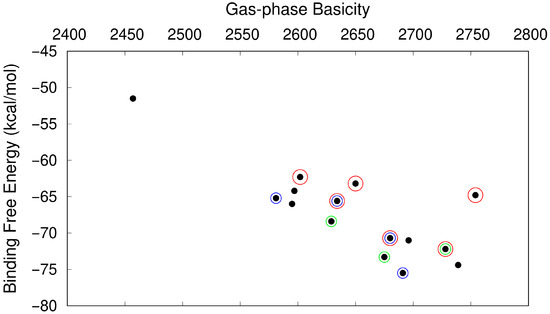 Correlation between the basicity of the clusters and the calculated binding free energies (at 298.15 K, 1 atm). The red circle indicates that TMA is present, the green circle includes DMA and includes both DMA and EDA.