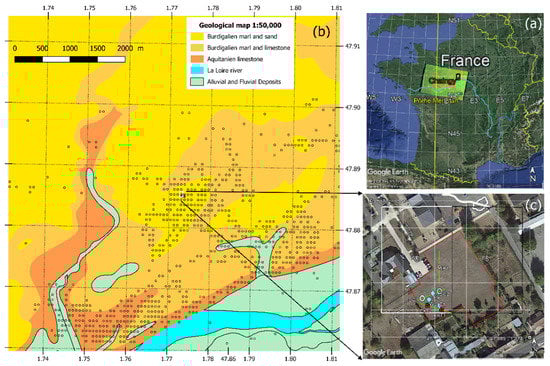 Among the various natural risks in France, the risk due to shrinking and swelling of subsurface clays is the second most important cause of financial compensation from insurance companies behind the flooding risk. In 2010, a first shrink/swell hazard map of metropolitan France, based on 1:50,000 geological maps, geotechnical data and spatial distribution of building damages has been published by the French Geological Survey (BRGM). So far, in situ monitoring of soil moisture and ground movements and ex situ clay characterization are traditionally used to assess this risk (e.g., the Mormoiron site with a Mediterranean climate [] or at the Pessac site with an oceanic climate []). Since 2016, a new site characterized by a high shrink/swell hazard, level and located at Chaingy (France) has been instrumented by BRGM.