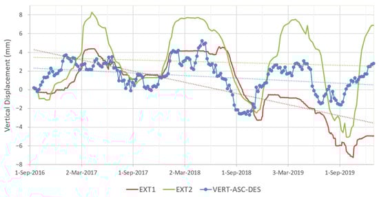 Displacements measured by InSAR are in the direction of the Line-of-Sight (LoS) of the satellite, while displacements measured by extensometers depict motion in the vertical direction. However, the combination of ascending and descending InSAR measurements for the calculation of the actual vertical motion component (VERT-ASC-DESC) allows the direct inter-comparison of satellite and in situ observations.