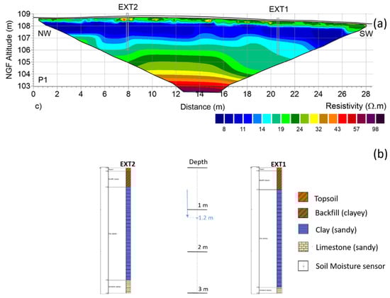 Along the EXT1-EXT2 resistivity profile (Figure 3), the mean depth and thickness of the clay material layer is 0.46 m ± 0.05 m (min-max, 0.34–0.55) and 1.97 m ± 0.18 m (min-max, 1.70–2.39), respectively. The mean depth of the carbonate layer is 2.43 m ± 0.16 m (min-max, 2.15–2.73). The depth (approximately at 0.5 m) and thickness (about 2.3 m) of the clay layer at EXT1 and EXT2 are very similar (Figure 3). However, the resistivity of the clay layer at EXT2 is much lower compared to EXT1, indicating that the clay fraction is much higher beneath EXT2 []. That is also consistent with the expansion difference between the extensometers showing a much higher swelling magnitude at EXT2.