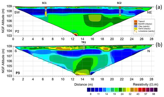 We used two drill cores along the SC1-SC2 profile to define the clay subsurface material by the resistivity value [] (Figure 4). A first layer above the depth of 0.59 m ± 0.22 m corresponds to topsoil and backfill with some clay lenses (Figure 3 and Figure 4). A second layer with a mean thickness of 1.5 m ± 0.42 m corresponds to the clay material with a resistivity lower than 17 Ω.m ± 1 Ω.m. Below 2.09 m ± 0.42 m, a third layer corresponds to sandy limestones with a resistivity gradient due to the weathering process.