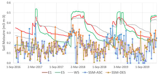 Comparison of three soil moistures at about 1.2 m depth (E1, E5, W5) to the Surface Soil Moisture SSM-ASC and SSM-DES using the SMOS ascending and descending track, respectively.