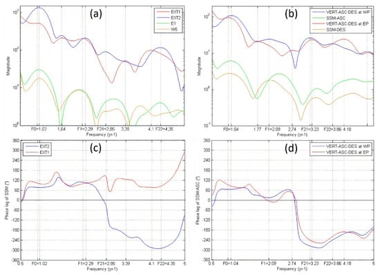 In the top, the magnitude of the Fast Fourier Transform (FFT) of different time series between frequencies 0.5 and 5 year−1 are shown: (a) vertical displacement of both extensometers (EXT1 and EXT2) and the Soil Moisture at E1 and W5 (about 1.2 m depth), (b) VERT-ASC-DES for vertical displacement using ascending and descending S-1A/1B tracks at West Point (WP) and East Point (EP), and SSM-ASC and SSM-DES for the Surface Soil Moisture using the ascending and descending SMOS track, respectively. In the bottom, the phase angle difference in degrees between the FFT of the SSM-ASC using SMOS ascending track and the FFT of the displacement of four time series are shown: (c) EXT1 and EXT2 and (d) VERT-ASC-DES at WP and EP.
