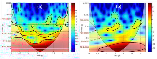 The continuous wavelet transform (CWT) during 3.3 years (September 2016–December 2020) are shown for two vertical displacements: (a) EXT2 and (b) VERT-ASC-DES at WP. The thick contour designates the 5% significant level against red noise (see Materials and Methods section). The Cone of Influence (COI) where edge effects might distort the picture is shown as a lighter shadow.