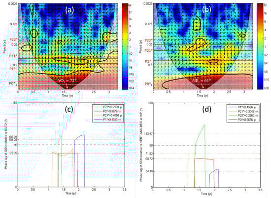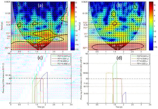 In the top, the cross wavelet transform (XWT) between SSM-ASC using SMOS ascending track and two times series is shown: (a) EXT1 and (b) VERT-ASC-DES at East Point (EP). The relative phase relationship is shown as arrows, with in-phase pointing right and anti-phase pointing left and the Surface Soil Moisture leading by 90° pointing straight down. The Cone of Influence (COI) where edge effects might distort the picture is shown as a lighter shadow. In the bottom, the phase lags ΔΦ of SSM-ASC relative to the same times series are shown: (c) EXT1 and (d) VERT-ASC-DES at EP. The shrinking (P1*) and swelling (P21* and P22*) periods are found using the thick contours of XWT that designate the 5% significant level against red noise (see Materials and Methods section).