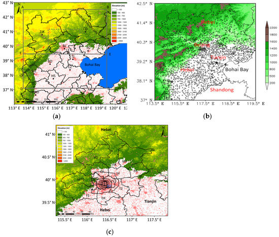 The BTH region is located in the northeast of the North China Plain (36.0°–42.3° N, 113.5°–120.0° E) [26]. The study area extended over the range 37.0°–42.5° N, 113.5°–119.0° E (shown by the large solid rectangle A–B–C–D, Figure 1a). The topography of the BTH region is complex; high terrain in the northwest declines with a semi-annular characteristic to an area of low terrain in the southeast. The Bashang Plateau is in the northwest of the BTH region. The Yanshan Mountains in the north and northeast of the region have East–West orientation. Huairou, Miyun, and Pinggu districts in the northwest and northeast of Beijing and the northern and northeastern areas of Tangshan City in northeastern Hebei are all located in the southern foothills of the Yanshan Mountains. In this article, they are called the northern foothills of Beijing and the southern foothills of Yanshan in northeastern Hebei. The Taihang Mountains in the west and southwest of the BTH region have Northeast–Southwest orientation, while Baoding City, Shijiazhuang City, Xingtai City, and Handan City in Hebei Province are located in the piedmont plain of the eastern Taihang Mountains. In addition, the area is intercut by Bohai Bay, which extends inland in the southeast of the BTH region (Figure 1a). The distribution of the AWSs within the study area is presented in Figure 1b.