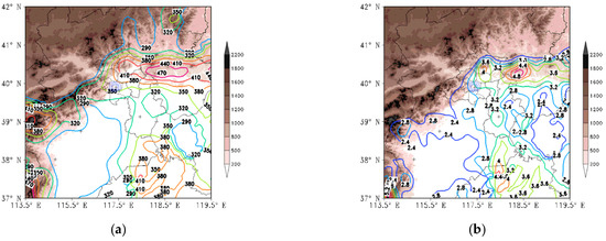 To investigate the impact on SDHR of the Yanshan Mountains in the northeast of Hebei Province, Taihang Mountains in the west, and land–sea topography in the southeast, the BTH region was divided into two zones. The northern zone extended over the range 39.2°–42.0° N, 113.5°–119.5° E (solid rectangle A–B–E–F, Figure 1a), and the southern zone extended over the range 37.0°–39.2° N, 113.5°–119.5° E (solid rectangle F–E–C–D, Figure 1a). The focus of study in the northern zone was on the impact on SDHR of the areas to the west and north of Beijing, the topography of the Yanshan Mountains in the northeast of the BTH region, and the Beijing urban area. The focus of study in the southern zone was on the impact on SDHR of the topography of the Taihang Mountains in the west and the differences in the underlying land–sea surface of the Bohai Bay region in the southeast.