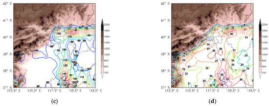 Calculation of the SDHR frequency, cumulative precipitation, and precipitation contribution rate at each station (≥20 mm h−1), in conjunction with investigation of the frequency distribution of precipitation (Figure 2a–c), reveal that the centers of high-frequency SDHR are located in the southern foothills of the Yanshan Mountains in northeastern Hebei Province, southern foothills of the mountainous area in the north of Beijing, eastern slopes of the Taihang Mountains, and west coast of Bohai Bay and surrounding inland areas (Figure 2b). The pattern of the centers of high SDHR frequency is similar to that of SDHR cumulative precipitation (Figure 2c). In central and eastern parts of Hebei Province, the southern foothills of the Yanshan Mountains in the northeast, and the Tianjin area, the contribution rate of precipitation to SDHR is relatively large, and the maximum can exceed 50% (Figure 2d). It shows that strong convective precipitation in the above areas in summer contributes substantially to the total cumulative precipitation (i.e., close to 50%). Therefore, the distribution of SDHR in summer in the BTH region is evidently affected by topography and the interlaced underlying land–sea surface.