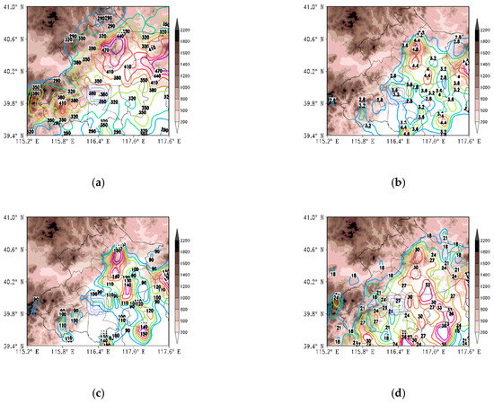 Same as Figure 2 but for Beijing. (a) Average annual precipitation (unit: mm), (b) SDHR annual average frequency (unit: times), (c) SDHR precipitation (mm), and (d) SDHR precipitation contribution rate (unit: %). (a–d) Colored shading represents terrain elevation (unit: m). Location of the center of the Beijing urban area is denoted by a plus symbol.