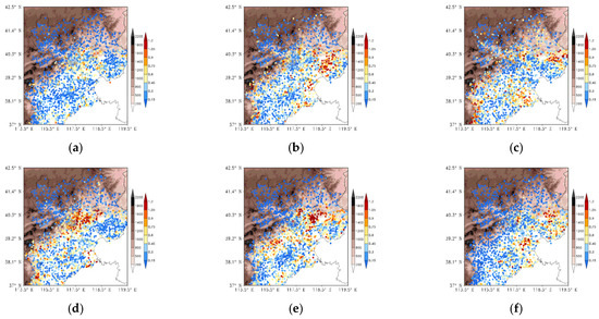 Distribution of SDHR frequency in the BTH region in six periods of days in summer (unit: times a−1). (a) 0900–1200, (b) 1300–1600, (c) 1700–2000, (d) 2100–0000, (e) 0100–0400, and (f) 0500–0800.