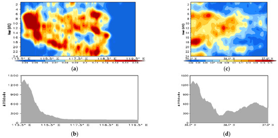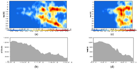 A time–distance plot (i.e., a Hovmöller diagram) can highlight the diurnal evolution and movement of SDHR, as well as the effect of topography on SDHR [3,7,8,13,21,22,23]. On the basis of interpolated gridded station data, Hovmöller diagrams of the averaged SDHR frequency in summer are shown in Figure 5 and Figure 6, together with the averaged topographic profile in the corresponding direction.