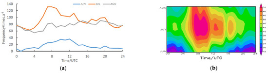 To study the characteristics of the diurnal variation of each month in summer, the cumulative SDHR times of multiple stations are calculated for each month, that is, every observation station appears in SDHR, and it will be accumulated one time. The diurnal variation of cumulative SDHR times of multiple stations in summer has approximately bimodal distribution across the entire BTH region (Figure 7b). The first peak occurs in the local afternoon to evening (1500–2100), the second peak occurs in the second half of the night (0300–0400), and the lowest frequency occurs during the morning (0900–1300). The diurnal variation of cumulative SDHR times of multiple stations in the BTH region in each month of summer (June, July, and August) has marked differences (Figure 7a). The SDHR frequency is highest in July, followed by August and then June. The diurnal variation in July has a double-peaked characteristic. The first peak occurs in the local afternoon (1500–1700), and the maximum peak is much greater than that in either August or June with a value of 131 times.h−1.a−1; the second peak occurs in the second half of the night (0300–0400). The diurnal variation in August also has double-peaked characteristics. The first peak occurs in the local early morning (0300–0500), and the maximum peak value is 91 times.h−1.a−1; the second peak occurs in the afternoon (15:00–16:00). The cumulative SDHR times of multiple stations in June is lower than that in either August or July, and the diurnal variation in June has a single peak that occurs in the evening (1800–2000).
