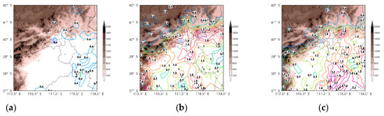 In the first half of the night (2100–0000), SDHR is highly prevalent in the Beijing area and to its east, in the southern foothills of the Yanshan Mountains in northeastern Hebei, and in the area of the eastern slopes and foothills of the Taihang Mountains in western Hebei. Moreover, the area of high SDHR is distributed in a band aligned NE–SW that exhibits eastward movement (Figure 4d,e). In the second half of the night (0100–0400), the area of high SDHR frequency moves eastward to the central and eastern plains of the BTH region, and the area of high SDHR in the eastern parts of Beijing moves slowly eastward. (Figure 4e). In the early morning (0500–0800), the main body of SDHR occurs over the east of the region and the spatial extent of SDHR is reduced substantially (Figure 4f). The range of SDHR is reduced markedly during 0900–1200 (morning), occurring primarily in southern and eastern areas of Beijing (Figure 4a).