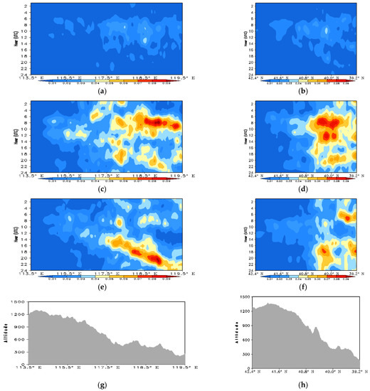 By dividing the BTH region into southern and northern zones, the impact on SDHR of the northwestern mountains, northern Yanshan Mountains, southwestern Taihang Mountains, and land–sea terrain in the southeast can be investigated. Hovmöller diagrams of the longitudinal averages (Figure 5a,b) and latitudinal averages (Figure 5c,d) for the northern zone (solid rectangle A–B–E–F, Figure 1) are analyzed. In the northwestern mountainous area of the BTH region (40.8°–42.5° N, 113.5°–116.0° E) and the northeastern mountainous area (40.8°–42.5° N, 116.0°–119.5° E), the SDHR frequency is low, and the diurnal variation of SDHR frequency has single-peak characteristics with the peak appearing primarily in the afternoon and evening (1500–2000).