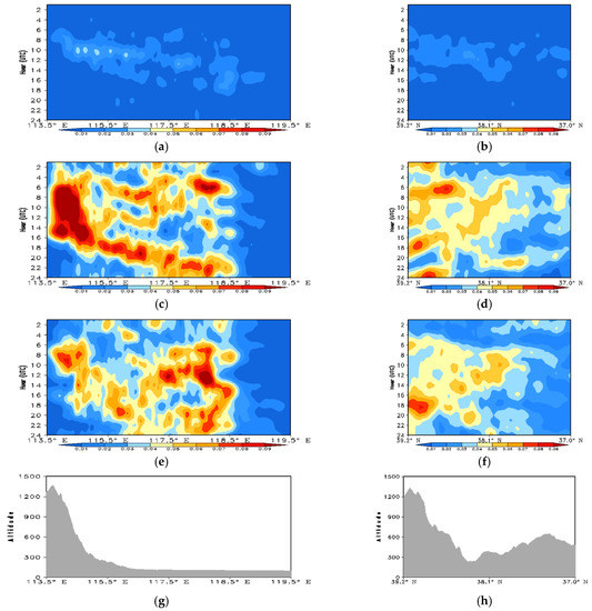 Hovmöller diagrams of averaged frequency of SDHR and averaged topographic profiles in the northern zone of the BTH region. (a,b) June, (c,d) July, and (e,f) August. (a,c,e,g) Latitudinal averages (39.2°–42.5° N) and (b,d,f,h) longitudinal averages (113.5°–119.5° E).