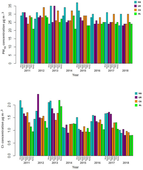 The ions analyzed contribute to 33%, 34%, 35%, and 37% of the PM10 collected for sampling sites UR, HA, AL, and CA, respectively, per the following sequence of individual contribution: SO42− > Cl− > NO3− > PO43− > NO2− > C2O42− > HCOO− > F− > CH3COO−. As shown in Figure 3, the PM10 concentrations recorded for the sampling sites during the dry season (December–April) were slightly higher than those recorded during the rainy season (May–November), with some key exceptions. In the dry period, the metropolitan area is influenced by trade winds from the Caribbean Sea, which can have speeds of up to 30 kmh−1 and cause a considerable drop in the region’s precipitation levels. For the same reason, recorded concentrations of Cl−, mainly resulting from the effects of the marine spray, were higher in the dry season. In the case of ions such as nitrate, the formation of which is linked to a transformation from the gaseous to the particle phase, concentrations were higher during the rainy season than the dry season in the majority of cases, possibly because temperatures are lower during this period, while the trade winds that help clear pollutants from the metropolitan area are reduced.