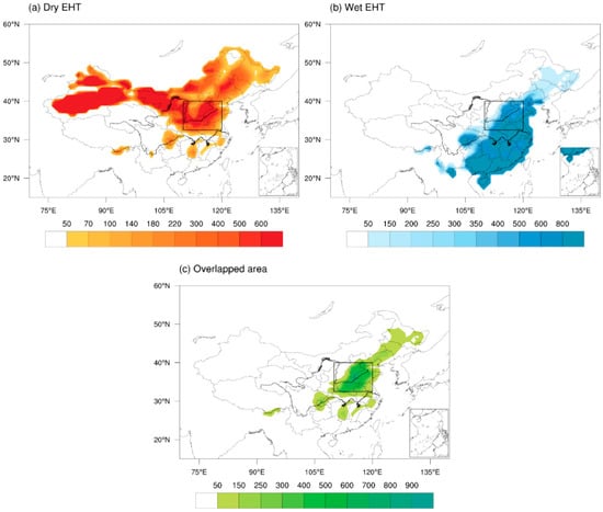 The sum of EHT frequency distribution of dry and wet in China from 1961 to 2016 in summer (June-august) (unit: day). (a) Dry EHT area, (b) wet EHT area, (c) overlapped area. Black box (32.5°–45° N, 110°–120° E) indicates the regions of the MLRYR. The value in (c) is the minimum of dry and wet EHT days.
