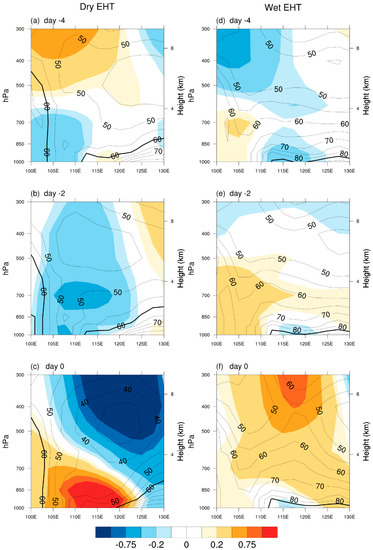Vertical cross-sections of the average zonal air temperature anomaly (colors; unit: K) and relative humidity (isopleth) from 32.5° to 40° N on dry EHT and wet EHT days in the MLRYR (from day −4 to day 0 (a–c): dry EHT onset days, (d–f): wet EHT onset days).