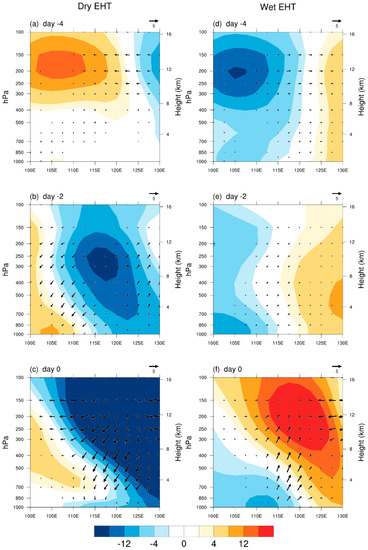 Vertical cross-sections of GPH anomalies (shadings; unit: gpm) and zonal vertical velocity (vector; vertical velocity; unit: pa/s, scale 100 pa/s; zonal wind; unit: m/s) averaged from 32.5° to 40° N from day −4 to onset day for dry EHT days (a–c) and wet EHT days (d–f).
