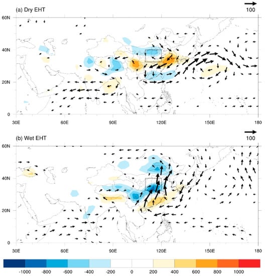 Some studies [43,44] have suggested that water vapor transport and diabatic heating in China are closely related to the location of the WPSH. The times of the two northward jumps of the WPSH correspond well to the position of the main rain belt in eastern China. Thus, northward WPSH can bring more water vapor to northern China. Water vapor can directly affect the relative humidity in the air, so the difference in water vapor is crucial for the two types of EHT. The difference in water vapor between dry EHT and wet EHT days can be seen in Figure 4. There is less water vapor in the MLRYR for dry EHT days. However, when a wet EHT day occurs, there is more water vapor, showing a clear convergence of water vapor brought by the south wind, which mainly comes from the western Pacific and the northern Indian Ocean. Thus, this difference in the amount of water vapor may be due to the location difference of the WPSH in dry and wet EHT days.