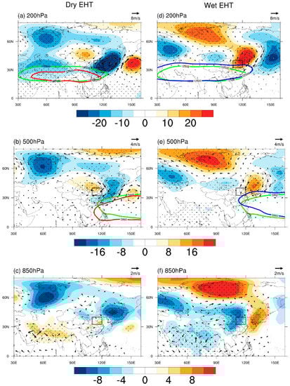 Composite anomalies of GPH (shadings; unit: gpm; dotted areas are significant at the 99% confidence level) and wind (vector; unit: m/s) for dry and wet EHT days in MLRYR. (a–c): dry EHT, (d–f): wet EHT. The solid green lines are the climatological-mean bodies of SAH at 200 hPa and WPSH at 500 hPa, and the red (blue) lines at 200 hPa and 500 hPa are SAH and WPSH bodies for the dry (wet) EHT days.