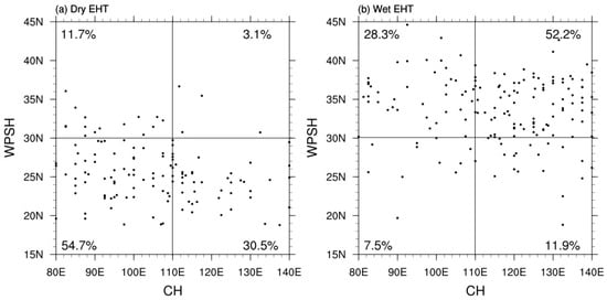 Scatter diagram of the zonal location of CH and the latitude location of the WPSH for (a) dry and (b) wet EHT days. The percentage in each quadrant is the proportion of EHT days in this quadrant to EHT days in these four quadrants.
