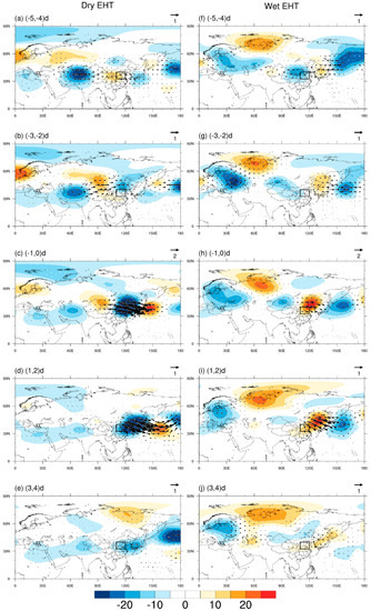Composite evolution of 200 hPa Plumb wave activity flux (vectors; unit: m2/s2) and geopotential height anomalies (colors; unit: gpm) (from day −5 to day −4 for (a–e): dry EHT onset days, (f–j): wet EHT onset days).
