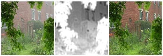 Following these existing methods, we further develop a new dehazing method based on a sparse contextual representation. Sparse representation has been commonly used for image denoising, super-resolution, deblurring, and other restoration tasks [,]. In this work, we propose a new sparse contextual representation to reduce the halo and block artifacts in the image dehazing task. Our proposed method is based on two observations. The first one is that the depth or transmission map keeps the main structure of the original input image. Another one is that the depth or transmission map is locally smooth. Therefore, we use the sparse representation to smooth the boundary-constrained map. In the proposed method, we obtain two different transmission maps—one of them provides the main structure while the other retains the image details. We fuse these two transmission maps using the sparse contextual representation and obtain the refined transmission map. Figure 2 illustrates an example of our proposed algorithm using sparse representation, from which we observe that our proposed method can recover a smooth transmission map and generate a high-quality haze-free image.