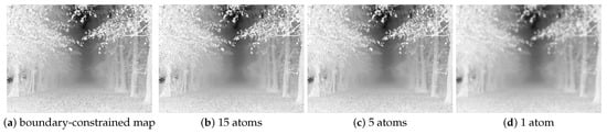 To smooth an image, we propose to use sparse representation to obtain a smooth transmission map. First we define an under-complete dictionary with K atoms (). We learn such a dictionary from the original image. Figure 3 illustrates some smooth results on a boundary-constrained transmission map consisting of the lower bounds of transmission coefficients with a patch and 1 atom, 5 atoms and 15 atoms, respectively. From Figure 3, we can observe that the details are gradually lack in the local regions with the reduction of the number of the used atoms. In Figure 3d, only the main structure was maintained. In this paper, we use 5 atoms to construct the dictionary.