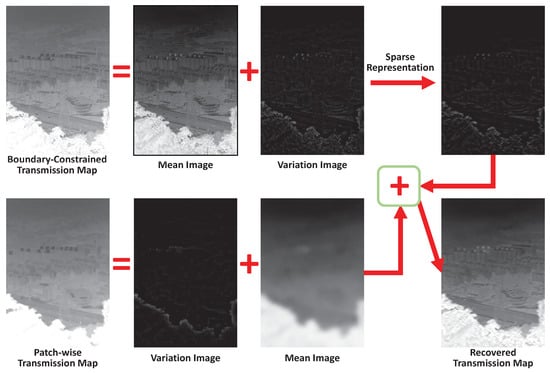 In this paper, we propose the sparse contextual representation to predict the final transmission map. According to [], we find that the final transmission map loses a lot of local details of the original image. Thus, we can use an under-complete dictionary to represent the transmission map, which will maintain the main structure of the image but lose some local details. Figure 4 shows the whole framework recovering the transmission map using sparse representation. First we apply a mean subtraction on the boundary-constrained transmission map to get a variation image, which accounts for the local details in the transmission map. This variation image is further smoothed using sparse representation as described above. To keep the main structure of the original input image in the final transmission map, we apply a mean filter (3 × 3) on the patch-wise transmission map to get a mean image, which keeps the main structure. Finally, we recover the final transmission map by adding this mean image and the smoothed variation image, as shown in Figure 4. In this way, the final transmission map can maintain the main structure of the original image and lose a lot of local details due to the sparse-representation-based smooth operation.