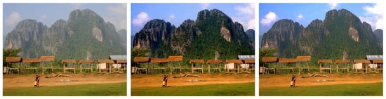 As shown in Table 1, the compared methods cannot achieve better results according to the indicator ‘e’, only our method, DCP [], Kopf et al.’s approach, Tarel et al.’s approach, Choi et al.’s approach and Ancuti et al.’s approach [] produced positive values for this metric. The proposed method achieves the highest value of ‘e’, which indicates that the proposed method achieves better visibility enhancement. The result of Tan, Ancuti, and Tarel was due to oversaturation, while Kopf, DCP, and the proposed method achieve a reasonable enhancement. In addition, our results obtain small values of the non-reference metric of ‘∑’, which means that our algorithm generates less oversaturated regions.