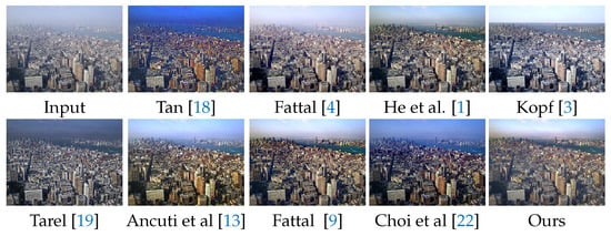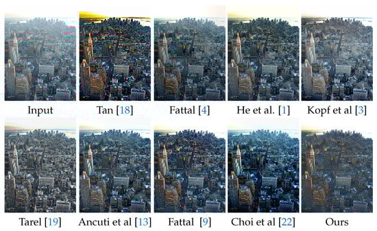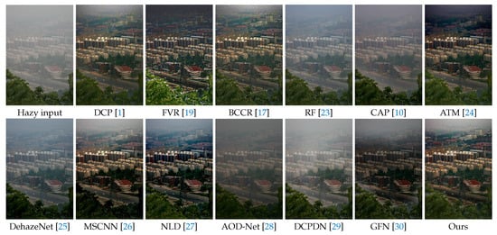 Second, we compare the proposed method with recent state-of-the-art methods [,,,,,,,,]. From Figure 10, we can see that the results of RF [] and CAP [] tend to retain haze. The results of learning-based methods [,,] also retain haze. The reason for learning based methods can not remove haze from real haze images is that they have a problem of domain shirt. The learning-based methods are trained on synthesized data, which are different form real hazy images. The proposed method improves the dehazed quality via multi-scale information.