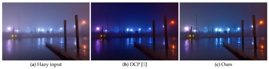 which implies that we can produce a dehazed image from a hazy input based on and t, a typical value of is 0.1, as shown in []. To facilitate the calculation, we normalize the intensities of the hazy input in the RGB color space and obtain