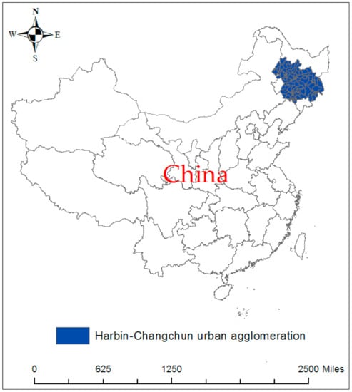 Therefore, this paper has selected a representative urban agglomeration among the four new national-level urban agglomerations in China, the Harbin–Changchun urban agglomeration, as the research object. The reasons are: First of all, this urban agglomeration is located in the traditional industrial base of Northeast China. Due to its developed heavy industry, it has historically been one of the main sources of carbon emissions in China [,,,]. Secondly, China attaches great importance to the economic development and urban construction of this region, and has successively issued a number of national-level policies to prioritize the economic construction and development of this urban agglomeration, which has further brought challenges to carbon emission reduction in this region [,,]. Finally, unlike the Yangtze River Delta and the Pearl River Delta, the overall ecological environment of the Harbin–Changchun urban agglomeration is relatively fragile [,]. In recent years, with shrinking areas of forests and wetlands and weaker ability to absorb carbon emissions, it has become more urgent to conduct in-depth research on carbon emissions [,,].