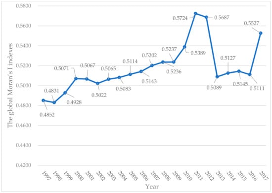 The global Moran’s I indexes of the Harbin–Changchun urban agglomeration from 1997 to 2017.