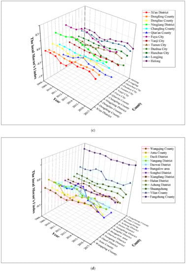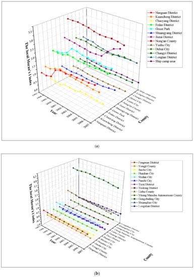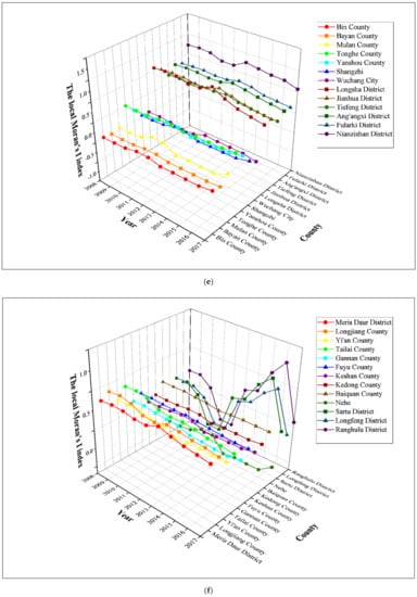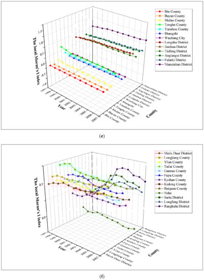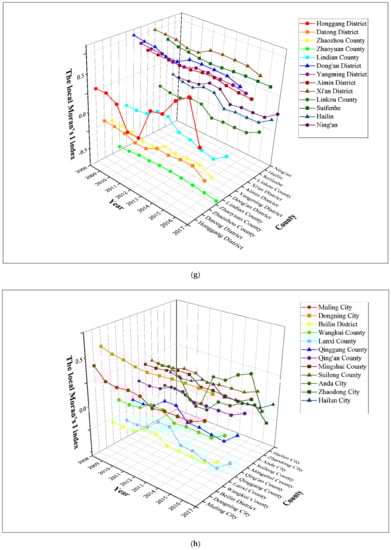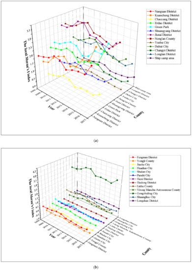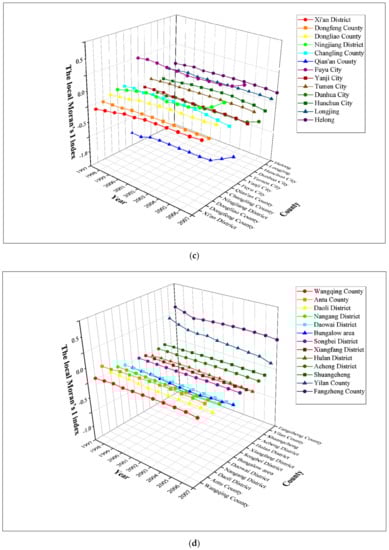Figure 2 and Table A1 in the Appendix C shows the global Moran’s I indexes of the Harbin–Changchun urban agglomeration from 1997 to 2017 based on methods introduced in Section 2.