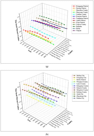 The local Moran’s I index of the Harbin–Changchun urban agglomeration from 1997 to 2007 (Panel (a–h) include the 103 counties).