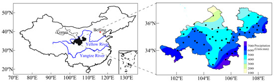 The climate in the study area is characterized as Dw (snow climate with dry winter) according to the Köppen–Geiger classification [31]. Annual precipitation is between 200 and 700 mm, and the precipitation in the north is less than that in the south. Daily meteorological data including air temperature, precipitation, wind velocity, sunshine hours, and relative humidity of 55 meteorological stations in eastern Gansu province from 1960 to 2017 were used in this study. The data were derived from the meteorological data sharing network of the China Meteorological Administration, and homogenization and quality control checks, such as the time consistency, space consistency, extreme value check, climate limit value, or allowable value check, were performed [32,33,34]. Figure 1 shows the distribution of the study area, meteorological stations, and annual average precipitation in the region.