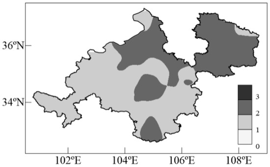 Figure 2 shows the average number of annual drought processes in the study region from 1960 to 2017. The results show that there were 1–3 drought processes per year in the study region, and drought processes in the eastern and central regions were higher than in the other regions.