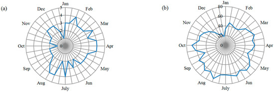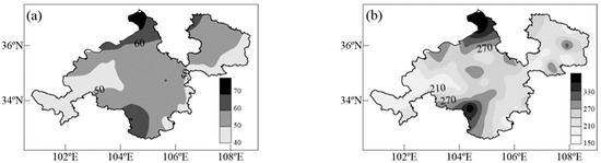 PCD ranges from 0 to approximately 1. The closer PCD is to 1, the higher the concentration degree, while the closer it is to 0, the more homogeneous the distribution of precipitation during the research period. Taking an extreme example, if the annual precipitation occurs only in a certain 10 days of a year, the ratio of the synthetic component with respect to the annual precipitation would be 1, the maximum value the PCD can approach. On the contrary, if the total precipitation of each 10 days within a year is evenly distributed, the PCD will reach the minimum 0. The PCP is the direction angle of the total synthetic component, pointing out the total effect of the synthesized 10 days’ precipitation and also representing the mean angle of the total synthesizing vector. For the calculation of PCP, the azimuth was set to 360° during the research period (one season in this study). In a season, the interval was 40° between each period of 10 days. For example, in March of spring, the first period of 10 days corresponds to 0–40°, the second corresponds to 40–80°, and so on, and the third period of 10 days in May corresponds to 320–360°. In the other three seasons, the azimuths corresponding to each period of 10 days were determined similarly.
