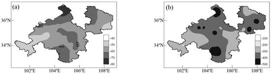 As shown in Figure 4a, average drought intensity in 1960 to 2017 was high in the north-central regions (−75.8), followed by the southwestern and some south-central regions (approximately −68). The maximum intensity of drought processes in the study area occurred in the central and eastern regions (Figure 4b). In the eastern areas, the most serious drought process occurred from 10 March 1995 to 11 January 1996. The cumulative intensity of the drought process reached up to −482.9 and lasted for 273 days. The second most serious drought occurred in the south-central region, from 1 June 1997 to 10 March 1998. The cumulative intensity was −464.4, and the drought lasted for 280 days. Additionally, in some of the middle regions, a stronger drought with a cumulative intensity of −430 to approximately −440 also occurred.