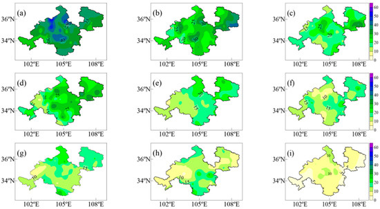 Frequency of different types of drought processes from 1960 to 2017 (%) ((a–d) are intra-seasonal droughts in the following order: spring drought, summer drought, autumn drought, and winter drought; (e–h) are extra-seasonal droughts in the following order: spring-summer, summer-autumn, autumn-winter, and winter-spring continuous drought; and (i) is the drought from summer to winter).