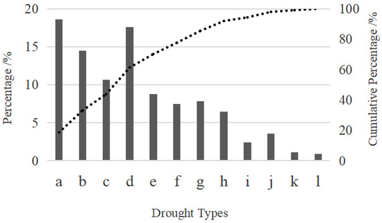 Percentage distribution and cumulative percentage distribution of different types of drought processes (a–d are intra-seasonal droughts in the following order: spring drought, summer drought, autumn drought, and winter drought; e–h are extra-seasonal droughts in the following order: spring-summer, summer-autumn, autumn-winter, and winter-spring continuous drought; and i–l are the drought processes that lasted for 3 seasons from spring, summer, autumn, and winter, respectively).