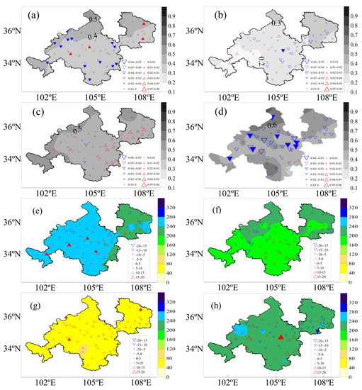 Average precipitation heterogeneity and its trend in each season. ((a–d) are PCD in spring, summer, autumn, and winter, respectively; (e–h) are PCP in spring, summer, autumn, and winter, respectively; solid indicates the trend is significant at the 0.05 level based on the Student’s t-test).