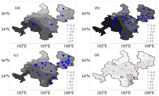 Drought is strongly related to the reduction in the frequency in light and moderate rain [2,20]. Figure 9a–d shows the distribution and the trend of the days with light and moderate rain during 1960 to 2017. Except for winter, most of the days with light and moderate rain were approximately 20–40 days per season. The southwest had more days with light and moderate rain than easterly and northerly regions. In the last 58 years, in addition to the insignificant change in winter, days with light and moderate rain showed a declining trend in the other seasons, especially in summer and autumn. Precipitation amount and the days with light and moderate rain in summer and autumn decreased significantly (figure not shown), but the number of heavy rain days increased in the study area over the last 58 years. Precipitation heterogeneity was enhanced, and both drought and flood risks increased.
