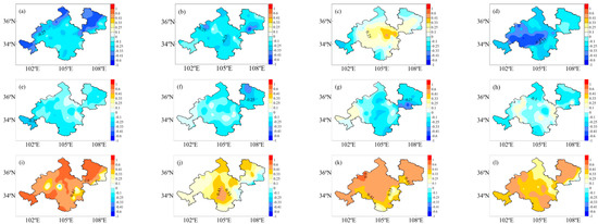 Correlation between drought intensity and precipitation heterogeneity in each season (columns 1–4 are spring, summer, autumn, and winter, respectively; (a–d) is PCD, (e–h) is PCP, (i–l) is the number of days with weak precipitation; r > 0.25 represent those significant at the 0.05 level based on the Student’s t-test).