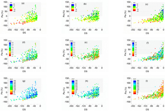 Because of the space limitations, only the correspondence of DS with precipitation and its heterogeneity in the eastern regions (east of 106° E) are shown in Figure 11. The horizontal and vertical axes represent the DS and precipitation anomaly percentages (Pa), respectively. The dots represent PCD, PCP, and the departure of the days with light and moderate rain (PD) in different drought grades. Across all seasons, droughts mainly occurred when there was less precipitation and a negative PD. Moreover, the smaller the PD, the stronger was the DS. The relationships between DS, PCD, and PCP were slightly more complicated. When the precipitation was low, the PCD and DS were larger. This was most prominent in the spring. In summer, the later the PCP, the stronger was the drought. When the precipitation was concentrated abnormally, even in the case of more precipitation, drought followed. At this time, PCD was ≥0.5 in spring and autumn, and ≥0.4 in summer. PCP was ≥240 in spring and summer; that is, after May and August, respectively. PCP was ≤80 in autumn (early and mid-September). In spring, the effects of PCD and PCP on drought were particularly significant. If PCD ≥ 0.5 and PCP ≥ 240 were defined as drought thresholds, drought occurred in 75% of the springs in the eastern regions, including 28% when associated with abundant precipitation. At that time, the average PCD and PCP were 0.6 and 290, respectively. In summer, PCD ≥ 0.4 and PCP ≥ 240 were regarded as the thresholds. In the eastern regions, drought occurred in 75% of periods, with 56% of periods having abundant precipitation. In autumn, PCD ≥ 0.5 and PCP ≤ 80 were the thresholds, and drought occurred in 34% of the periods, including 7% with abundant precipitation.
