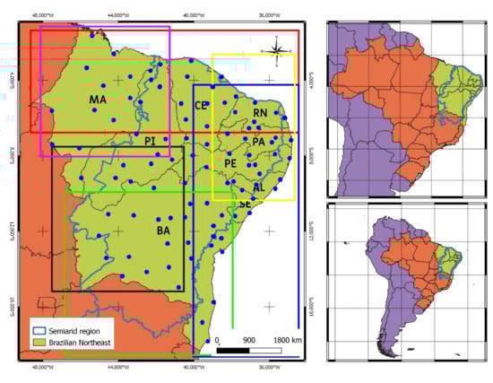 Map of the NEB (left) with the delimitation of the semiarid region and its location relative to Brazil (top right) and South America (bottom right). In the left panel, the blue points represent INMET’s weather stations. The climate subregions that are referred to throughout this study are graphically presented in the left panel encompassed by rectangles with the following colour associations: northern NEB, red; northwestern NEB, pink; northeastern NEB, yellow; eastern NEB, blue; southern NEB, green; southwestern NEB, black. Extracted from [28].