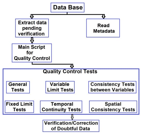 The QCS used in this study is based on a series of tests, called Test Groups. The flowchart shown in Figure 3 details the step-by-step procedure through which all the datasets were analysed. Every column with information was carefully studied, from the column that contains the station’s WMO identification code, to the columns that contain the data collection dates and the respective values of the meteorological variables.