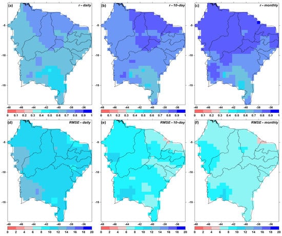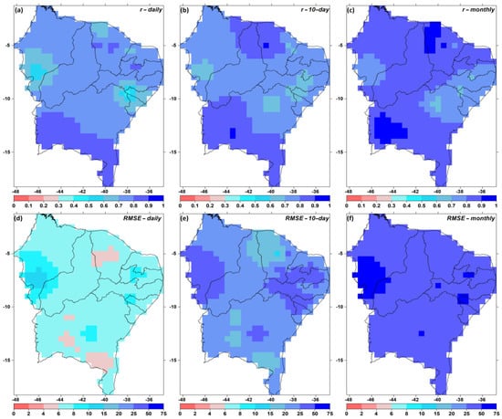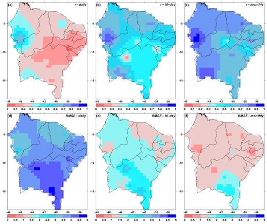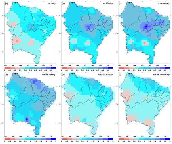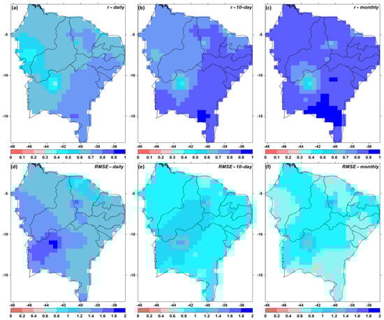 The results of the application of the same statistical techniques (correlation and RMSE) for the temperature variable are shown in Figure 5. Correlations gradually increased from the daily to the monthly timescales, exceeding 0.9 in some areas in central-south BA. Unlike precipitation, for which it was expected that errors would grow proportionally to the period of accumulation, for temperature, a reduction in the errors was expected, which is noticeable here in Figure 5d–f, in which there are areas with a maximum RMSE of almost 2 °C on the daily scale, dropping to 1.2 and 1.4 °C on the 10-day and monthly scales, with a minimum RMSE around 0.5 °C. For relative humidity (Figure 6), a similar behaviour to that of temperature was observed for both the correlations (Figure 6a–c) and the RMSE (Figure 6d–f). The area exhibiting the highest correlations is mostly located in the northern NEB, associated with the lowest RMSE values. In the centre-south of BA, the lowest correlations were observed and, in the west of BA, the highest RMSE values occurred, reaching up to 15% for the daily scale. For atmospheric pressure (Figure 7), moderate correlations were observed on the daily scale (Figure 7a), whereas the 10-day (Figure 7b) and monthly (Figure 7c) scales presented considerably higher values. The highest RMSE numbers were found in the west and south of BA, up to 5 hPa for the daily scale and up to 3.5 hPa for the monthly scale. The central north NEB showed the lowest values of RMSE, ranging from 1.5 to 3.5 hPa on the daily scale (Figure 7d), and from 0.5 to 2 hPa on the monthly scale (Figure 7f).